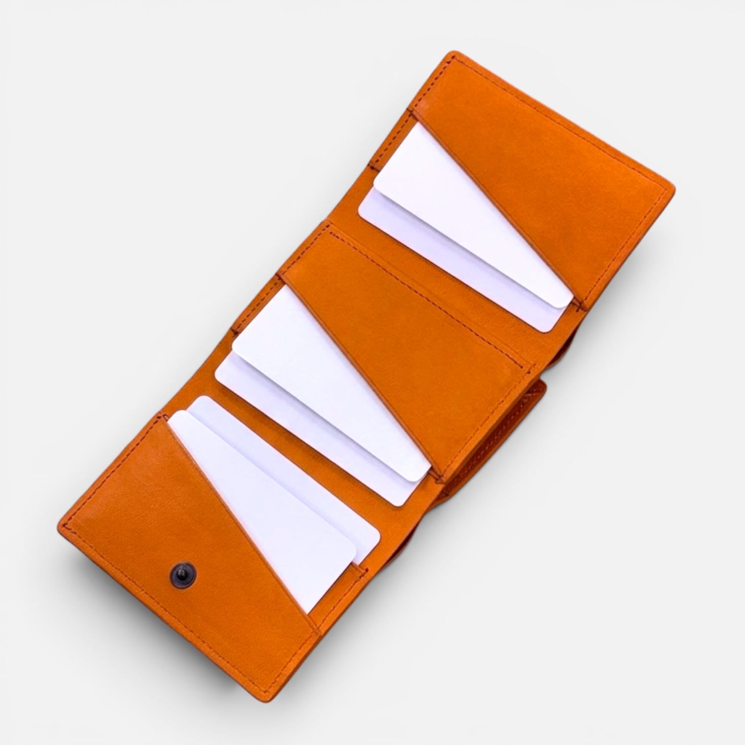 オレンジのレザーに、近似色のステッチでまとめた三つ折りウォレットです。